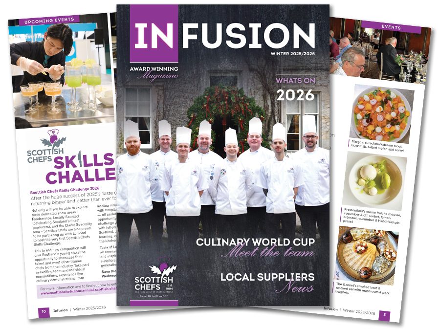 In this edition we’ve got previews of the brand new Skills Challenge event in March and the Worldchefs Congress taking place in Wales in May. As well as looking forward we also reflect on some fantastic recent events like our Infusion Lunch Clubs, the annual Nespresso Student Coffee Challenge and of course the famous Scottish Chefs Golf Day! And if that’s not enough there’s members news and an interview with a very special Edinburgh-based Chef. Get reading!